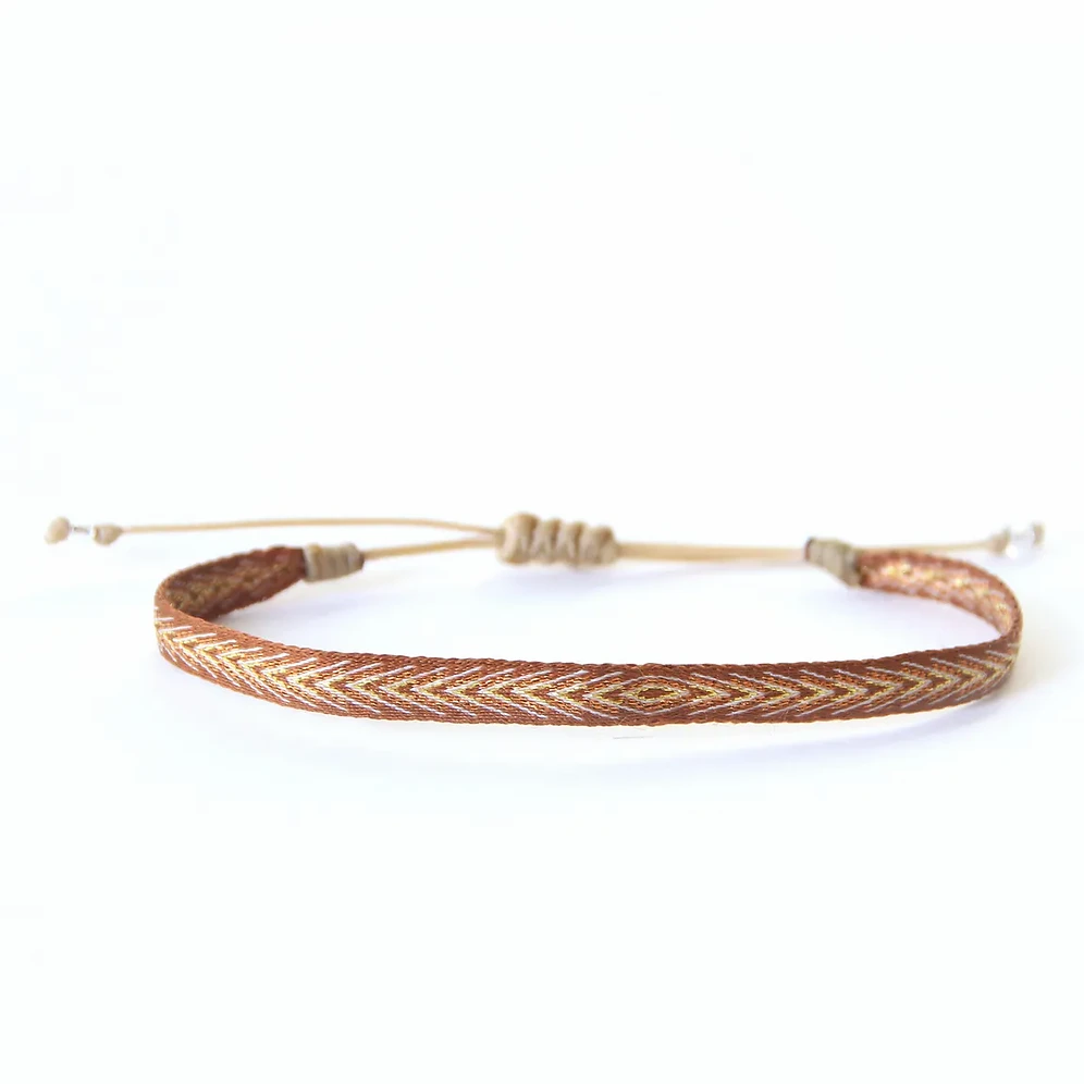 Bracelet large marron clair et blanc avec un fil métalisé doré et bronze. Ce bracelet est  100% fait à la main.