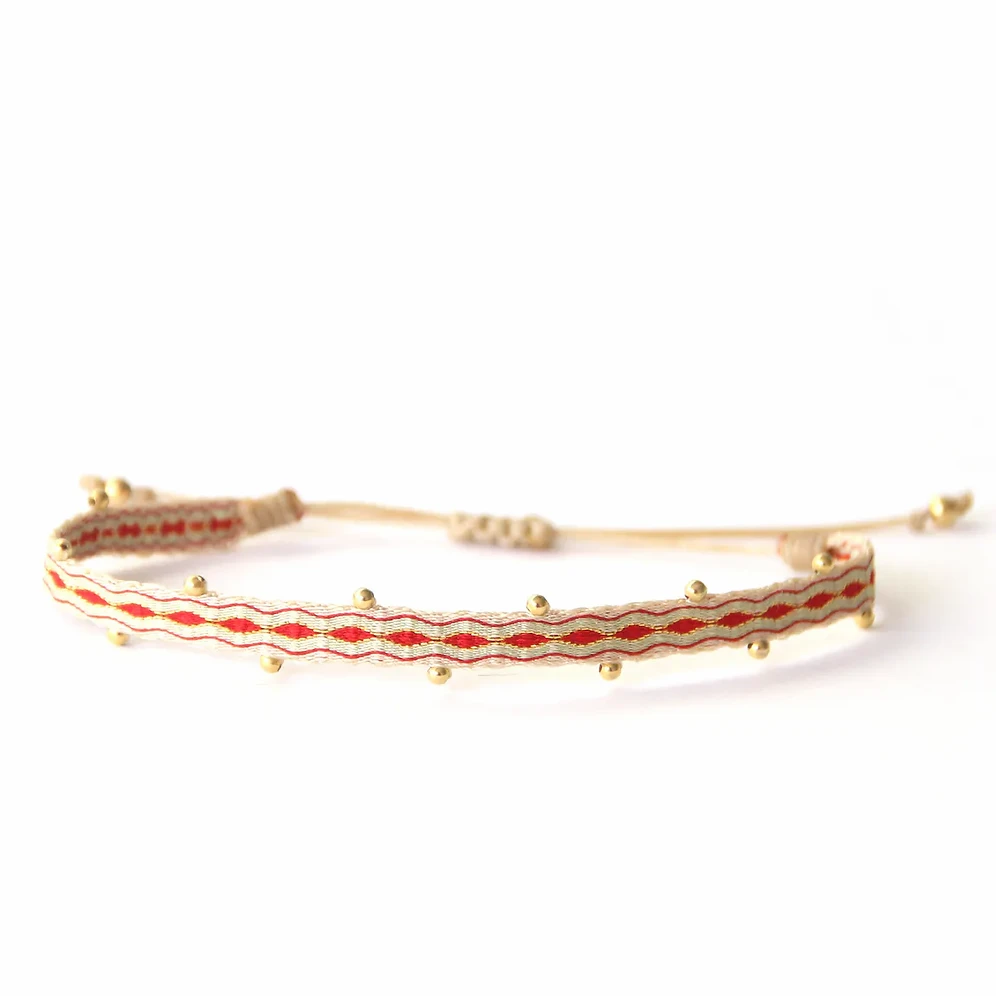 Bracelet ornĂ© de perles en or et tissĂ©s de rouge, de beige, de vert pistache et d’un fil mĂ©talisĂ© dorĂ©. Ce bracelet est 100% fait Ă la main.