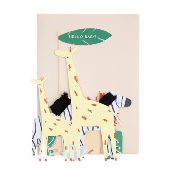 Une jolie carte pour annoner un heureux évènement. Dépliez-la pour découvrir la magnifique guirlande. Vous trouverez des girafes, zèbres et lions. Livrée avec une enveloppe assortie.