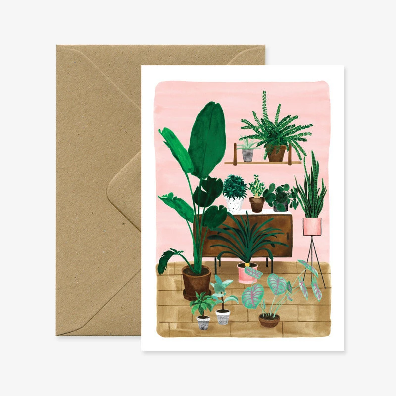 Une jolie carte peinte à la main représentant un salon rempli de plantes. Idéal pour les jardiniers ou les passionnées de plantes.
