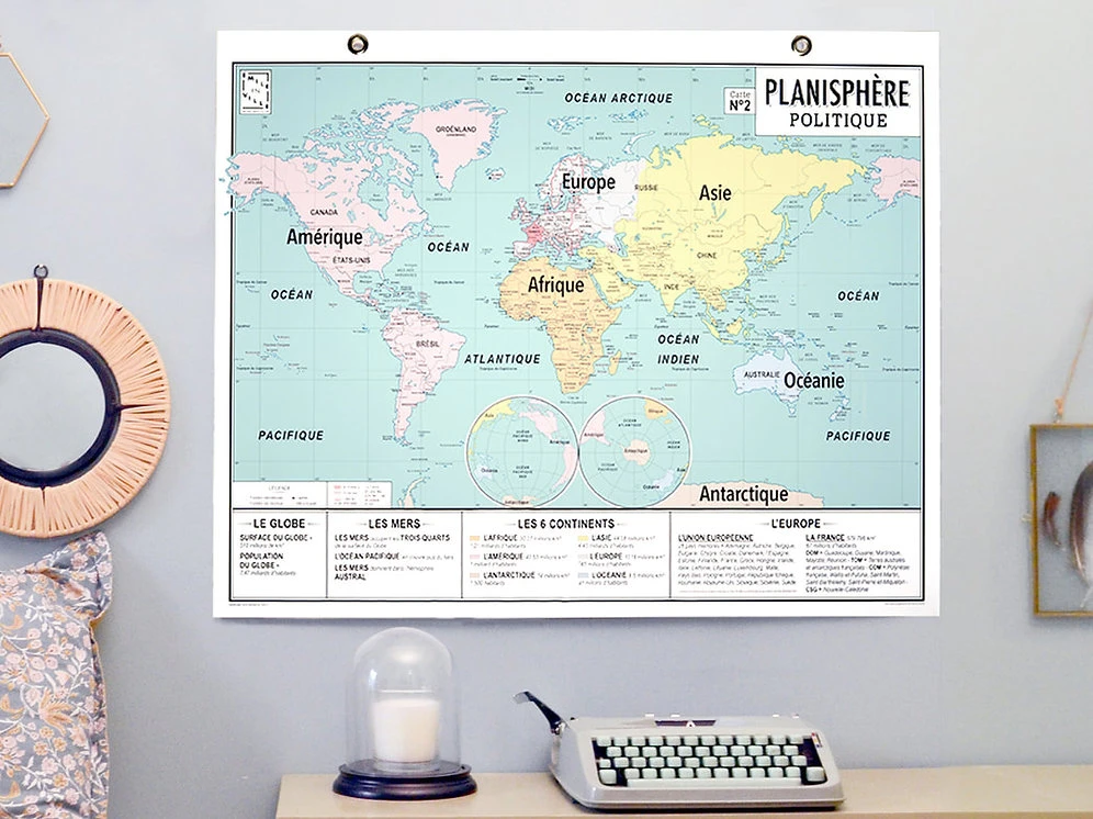 Un planisphère tendrement vintage qui met en avant les continents, les pays, les villes, les Ă®les… avec un zoom tout particulier sur la France et ses territoires d’Outre-Mer.