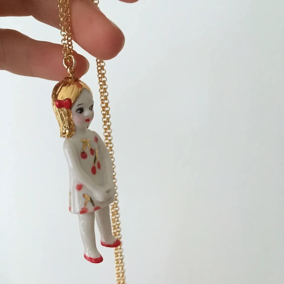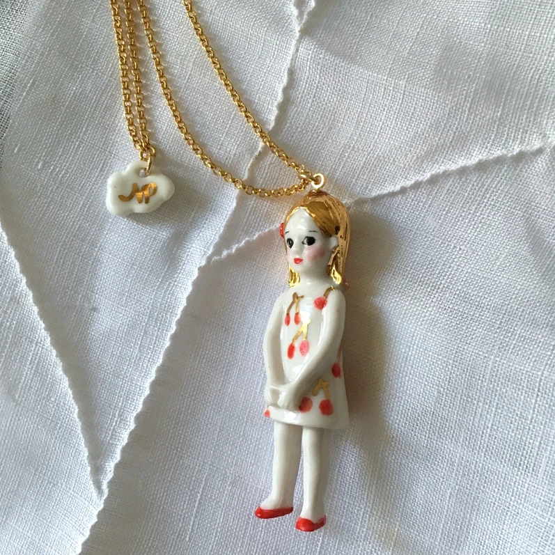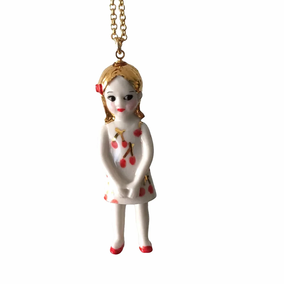 Jolie poupée à la robe décorée de ceries peintes à la main. Amusante et délicate cette précieuse amie en porcelaine ne vous quittera plus !