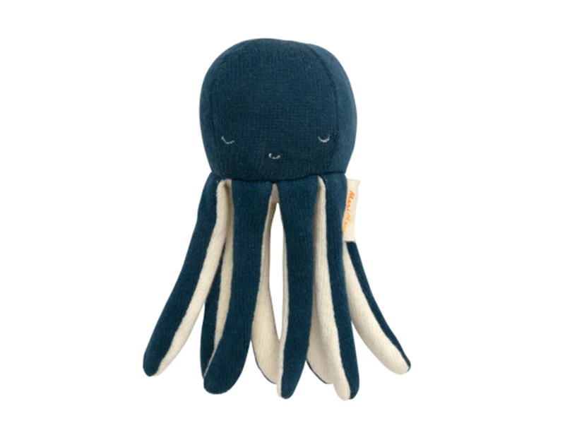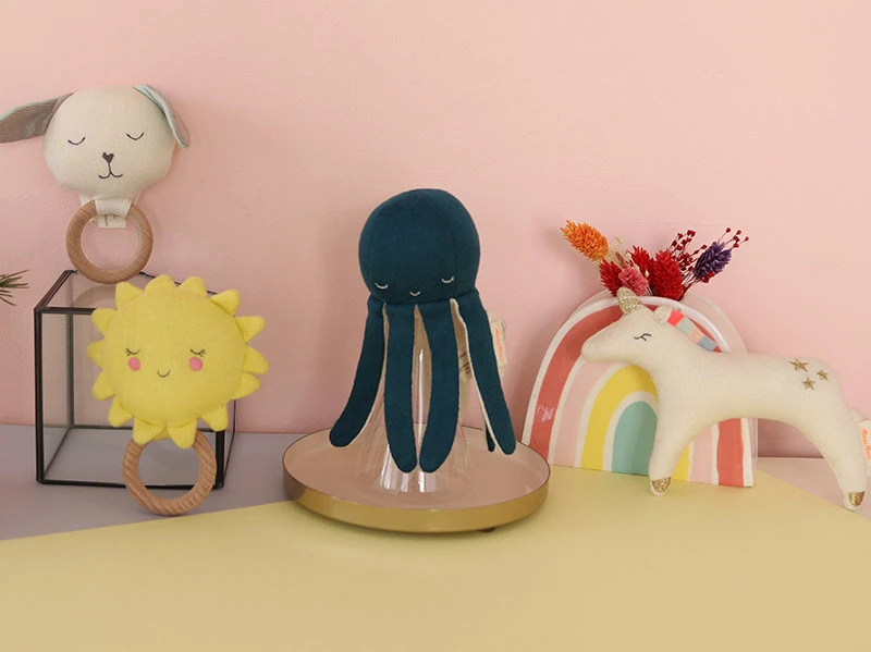 Un adorable hochet pour nouveau-né. Avec sa couleur bleue et ses petits yeux endormis, il accompagnera bébé pour ses nuits. Ce poulpe est très facile à prendre car il est moelleux. Cela va stimuler activement la motricité de votre enfant tout en stimulant ses réflexes de prise en main, dû à sa douceur, sa forme et sa composition mais aussi avec son très joli son de cloche.
