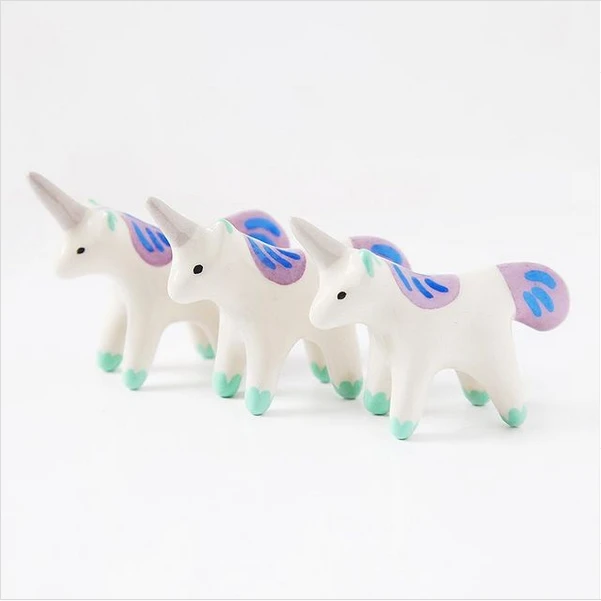 Une mini licorne en faïence, modelé et peint à la main dans leur atelier parisien.