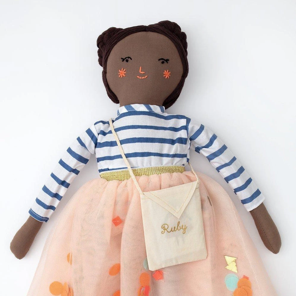 La poupĂ©e Ruby est très Ă©lĂ©gante, les enfants voudront s’amuser avec elle et mĂŞme lui faire des câlins. Avec sa chemise Ă rayures bleues, sa jupe tutu Ă sequins roses et ses cheveux en laine noire tressĂ©s , votre enfant pourra rĂŞver et voyager avec cette poupĂ©e.Â